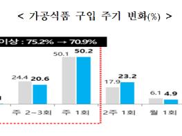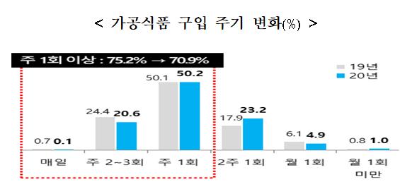 (구입주기) 가공식품 구입 주기는 ’주 1회 구입한다‘고 응답한 가구가 50.2%로 전체 가구의 절반을 차지하였고, 코로나19 영향으로 전년에 비해 주 1회 이상 구입 가구의 비율은 감소(2019: 75.2%→2020: 70.9)한 반면, 2주 1회 구입 비율은 증가(2019: 17.9% →2020: 23.2)하였다.