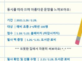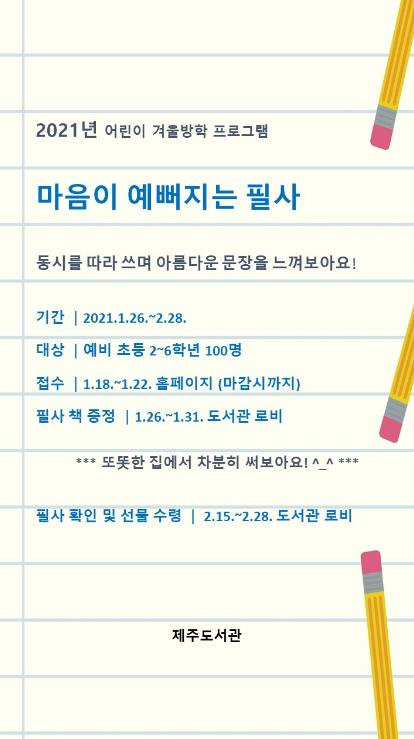 제주도서관은 겨울방학을 맞이하여 예비 초등 2~6학년 100명을 대상으로 2021년 어린이 겨울방학 프로그램 ‘마음이 예뻐지는 필사’를 운영한다.