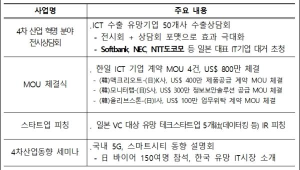 또한 유력 ICT분야의 일본시장 진출 조기 성약을 유도하기 위해 국내 ICT기업과 일본 바이어 간의 공급계약, 기술협력 등을 내용으로 하는 MOU 체결식이 진행되며, 스타트업 피칭과 세미나의 주요 주제를 대형 이벤트와 연관성이 큰 5G 관련 콘텐츠 및 스마트시티로 선정해 진행, 양국 기업 및 기관의 관심도를 높이고 협업 방안을 모색한다.