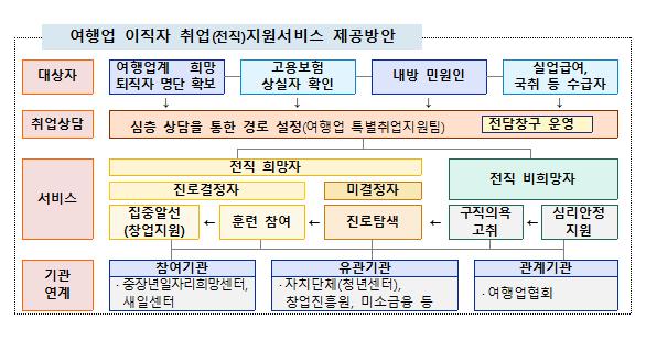 서울고용복지 센터에 설치되는 "여행업 특별취업지원팀"은 서울고용복지 센터 소장을 팀장으로, 중장년일자리희망센터, 새일센터, 여행업협회 등과 협업하여 구성되고, 지방자치단체, 창업진흥원, 미소금융 등과도 연계하여 이직자에게 필요한 다양한 서비스를 제공할 예정이다.