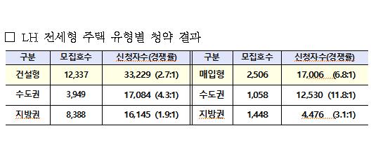 LH는 작년 12월 공고한 전세형 공공임대주택 총 14,843호에 대한 청약접수 결과 전국 평균 3.4:1의 경쟁률을 기록했다고 25일 밝혔다.