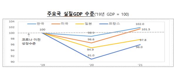 * 2020년 성장률(%) : (한국)△1.1 (미국)△3.4 (일본)△5.1 (독일)△5.4 (프랑스)△9.0 (이태리)△9.2 (스페인)△11.1
