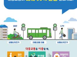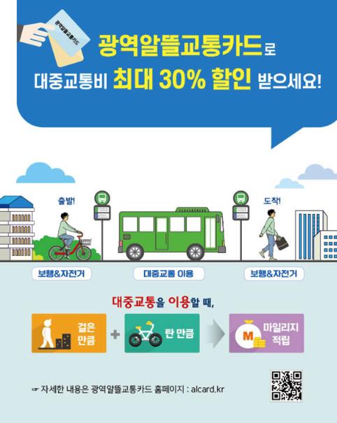 본 사업은 광역알뜰교통카드로 버스 이용시 친환경 이동거리(보행·자전거)에 비례하여 마일리지를 지원하는 사업으로 교통비의 최대 30%까지 할인받을 수 있다.