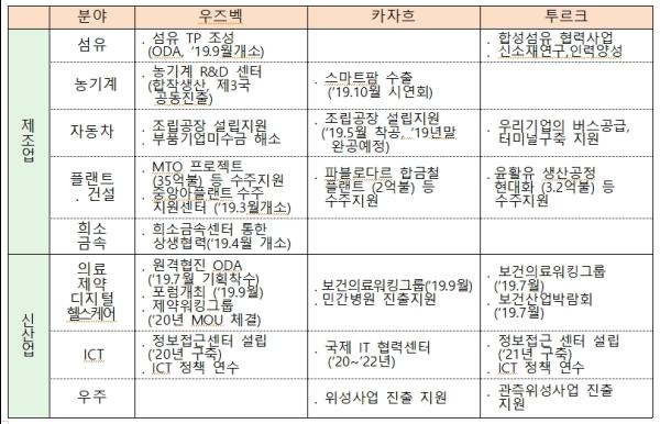 섬유 TP 구축, 농기계 R&D 센터, 자동차 조립공장 설립 지원 등 협력을 가속화해 중앙아 국가들의 산업화를 지원하는 한편, 장비, 부품수출 등을 통해 중앙아 진출 기회를 제공한다.