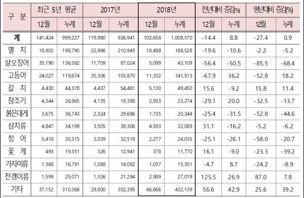살오징어, 붉은대게, 청어 등은 전년 대비 감소했다.