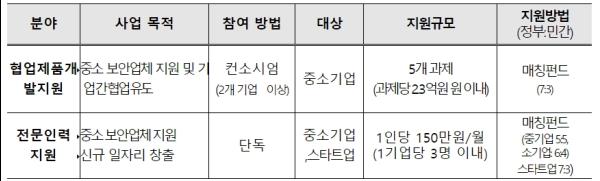 동 사업은 우수 기술력을 보유한 여러 중소기업이 상호 협업을 통해 산업 환경변화에 대응하는 경쟁력 있는 보안제품을 개발할 수 있도록 제품개발비 및 전문 인력을 지원하는 프로그램이다.