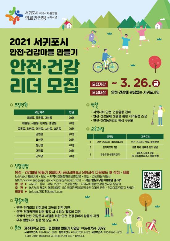 서귀포보건소에서는 지역사회 통합형 의료안전망 구축사업의 일환으로 추진중인 안전·건강마을 만들기 사업의 안전·건강 리더를 모집한다.
