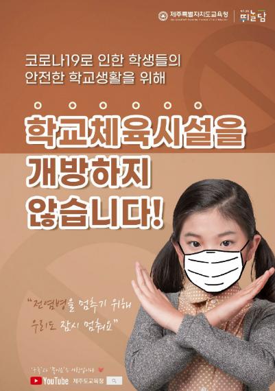 제주특별자치도교육청은 코로나19 감염 확산을 사전에 차단하고 신학기 학교 현장과 학생들의 안전을 도모하기 위해 학교 운동장과 체육관 등 학교체육시설을 현재와 같이 개방하지 않기로 했다.
