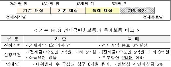 기존 전세금반환보증은 임대차 계약기간이 1/2이상 지난 경우에는 가입이 불가능했으나, 이번 특례보증 대상 확대를 통해 계약기간 종료 6개월 전까지도 가입이 가능해졌다.