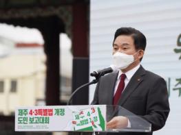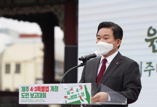 원희룡 지사는 이날 오전 10시 ‘4·3특별법 개정 도민 보고대회’에 참석해 4·3특별법 전부 개정에 따른 후속조치에 전 행정력을 집중하겠다며 이같이 밝혔다