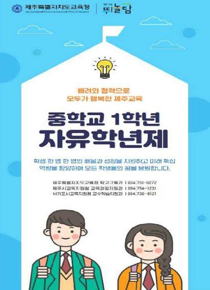 제주특별자치도교육청은 관내 중학교를 대상으로 자유학년제 이해를 돕기 위한 학생 및 학부모용 홍보 자료와 교원 지원용 운영 매뉴얼을 제작·배포하였다.