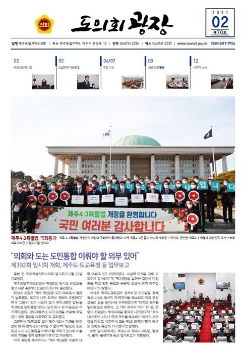 2월호는 제주 4.3특별법 개정안 국회 통과를 위한 노력과 함께 제392회 임시회에서의 위원회별 의정활동 상황과 의원발의 조례 현황, 그리고 사무처 소식을 뉴스로 다뤘다. 특히 더불어민주당, 국민의 힘, 그리고 미래제주 교섭단체 대표연설을 실어 올 한해 교섭단체별 의정활동 방향을 엿보게 했다.