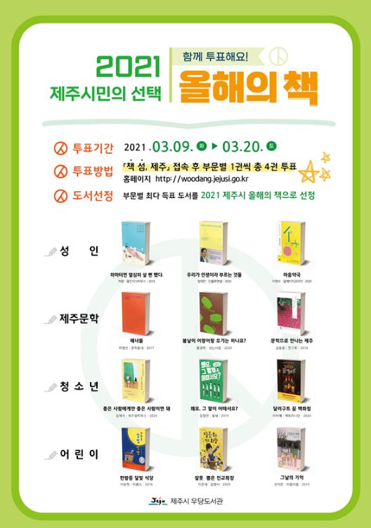 제주시 우당도서관은 ‘2021 제주시 올해의 책’ 선정을 위한 시민투표(홈페이지)를 3월 9일부터 20일까지 실시한다고 밝혔다.