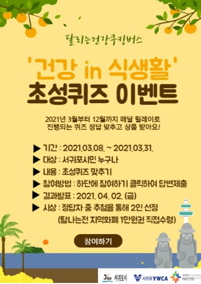 서귀포보건소(소장 강미애)와 서귀포YWCA(회장 고맹수)는 달리는 건강 쿠킹버스 활용 식생활 교육사업의 일환으로 『‘건강 in 식생활’초성퀴즈 이벤트』를 진행한다.