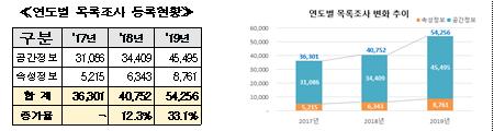 이번 공개하는 공간정보 목록은 ‘18년 40,752건 대비 13,504건이 증가한 54,256건으로, 전년도의 증가율 12.3%에 비해 매우 가파르게 증가폭을 나타내고 있다.