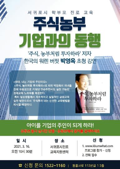 서귀포시교육지원청은 관내 유, 초, 중, 고등학교 재학생 학부모 대상으로 3월 16일(화) 오전 10시 30분부터 12시 30분까지 서귀포시진로교육지원센터에서‘애야, 너는 기업의 주인이다’의 저자 주식농부 박영옥회장 초청 강연을 실시한다.