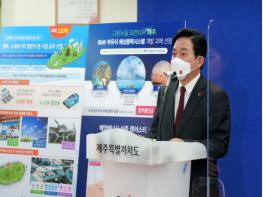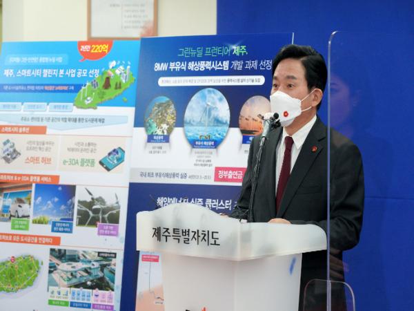 원희룡 제주특별자치도지사는 19일 제주도청 본관 2층 삼다홀에서 “제주의 청정 바람으로 에너지를 생산하고, 깨끗한 수소로 전환해 저장하고, 전기차, 드론 등 미래형 모빌리티에 활용하는 스마트한 미래, 신산업으로 새로운 먹거리를 키워가는 것이 제주형 그린뉴딜의 비전과 지향”이라고 밝혔다.