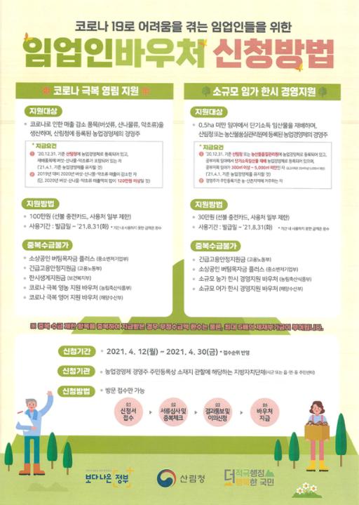 주요내용을 살펴보면 소규모 임가 한시적 경영지원과 코로나 극복 영림바우처로 구분되며, 지원대상으로는 단기소득 임산물을 생산하거나 전년도에 비해 매출이 감소된 품목을 생산하고 있는 농업경영체에 등록된 임업인으로 지원규모는 각각 임가당 30만원과 100만원이다.