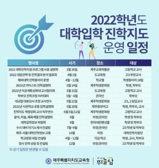 제주특별자치도교육청은 코로나19 상황으로 인해 어려운 여건 속에서도 도내 학교현장의 입시지도에 대한 불안감을 해소하고, 대학입학 진학지도에 전폭적으로 지원하기 위하여 ‘2022학년도 대학입학 진학지도 운영 일정’을 도내 고등학생, 학부모, 교사들을 대상으로 발표하였다.