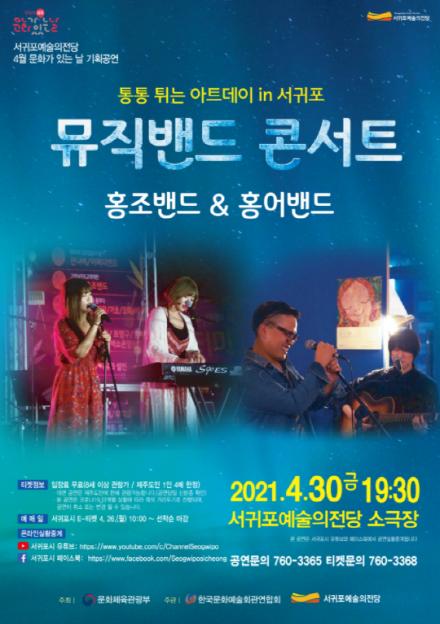 통통 튀는 아트데이 in 서귀포의 첫 번째 시리즈, 4월 문화가 있는 날 공연에는 도내에서 활발한 활동을 펼치고 있는 홍조밴드와 홍어밴드가 출연하는 '뮤직밴드 콘서트'가 개최된다.