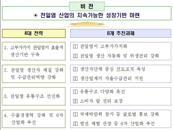 천일염산업 발전방안은 ‘천일염산업의 지속가능한 성장기반 마련’이라는 비전 아래 고부가가치 천일염의 효율적 생산기반 구축 천일염 생산자 체질 강화 및 수급관리 역량 강화 천일염 유통구조 선진화 수출경쟁력 강화 및 6차 산업화 추진이라는 4대 전략과 8대 추진과제를 담고 있다.