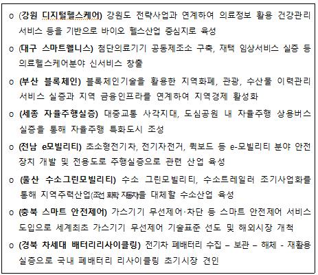 지자체가 요청한 규제샌드박스의 주요내용을 살펴보면, 개인정보, 원격의료, 자율주행, 전기차, 가스 무선제어 등 4차 산업혁명의 핵심분야를 총 망라하는 신산업·신기술 분야 규제특례로 구성되어 있다.