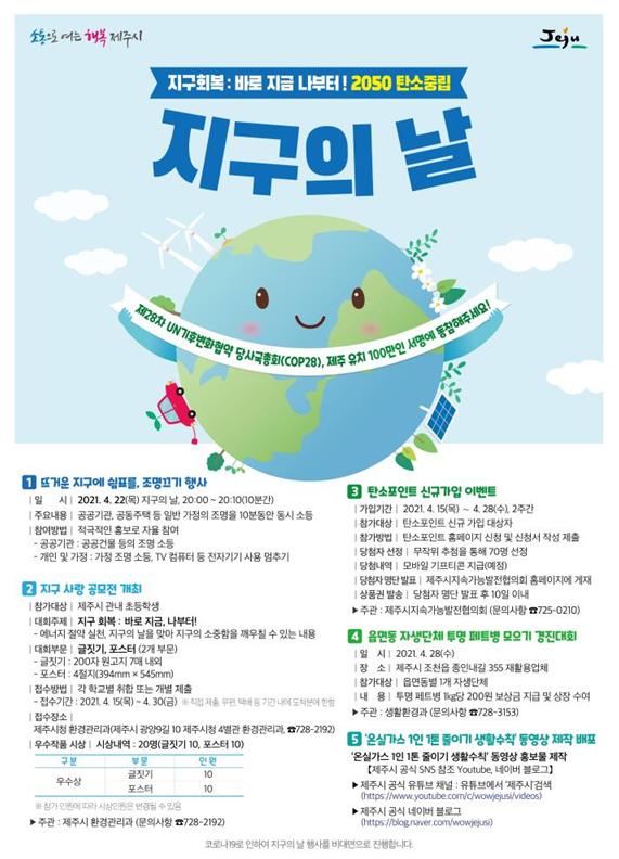 제주시는 오는 4월 22일부터 28일까지 기후변화주간을 운영하며 제51회 지구의 날1) 을 맞이해 ‘지구 회복 : 바로 지금 나부터’를 주제로 다양한 행사를 개최한다고 밝혔다.