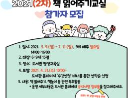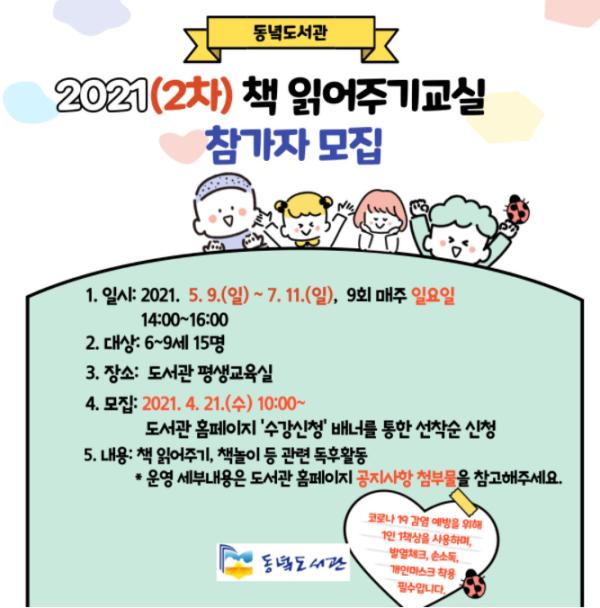 제주특별자치도교육청 동녘도서관은 유아 및 초등학생 저학년 대상의 2021년 2차 책 읽어주기 교실의 참가자를 모집한다.