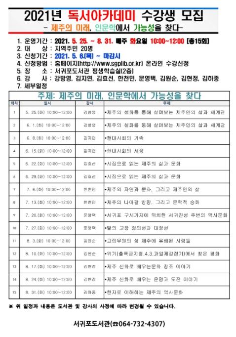 제주특별자치도교육청 서귀포도서관은 문화체육관광부가 주최하고 한국출판문화산업진흥원이 주관하는 ‘2021년 독서아카데미’ 공모사업에 선정되어 수강생을 모집한다.