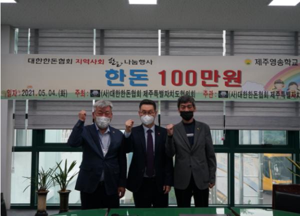 제주특별자치도교육청 제주영송학교는 지난 5월 4일 (사)대한한돈협회 제주지부에서 제주특별자치도협의회 지역사회 한돈 나눔 행사를 통해 1,000,000원 상당의 제주산 돼지고기를 학교에 기증하였다고 밝혔다.