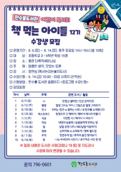 제주특별자치도교육청 한수풀도서관은 지역 어린이들이 체계적인 독서활동을 통해 자기주도적 독서습관을 기를 수 있도록 어린이 독서회 ‘책 먹는 아이들 12기’수강생을 모집한다.