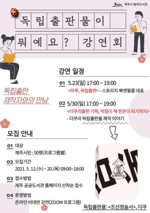제주시 탐라도서관은 오는 5월 23일과 30일, '특화도서관 육성지원사업' 5월 프로그램 ‘독립출판물이 뭐예요?’ 북토크를 운영한다.