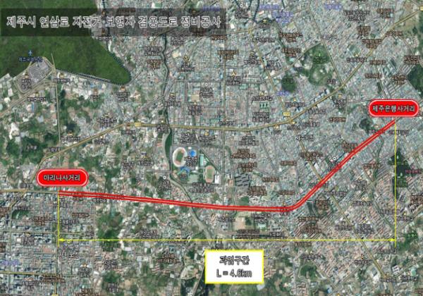 해당 정비공사는 연삼로 마리나호텔사거리에서 제주은행사거리까지 총 4.6㎞ 구간을 대상으로 이루어질 예정이며, 사업비 1억 6,000만원을 투입해 올해 6월까지 자전거 이용자 편의를 위한 자전거도로 포장 보수와 자전거횡단도, 표지판 및 노면표시 추가 설치를 실시할 계획이다.