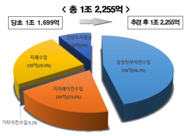 추경 예산안은 기정예산 1조 1,699억원보다 556억원(4.8%) 늘어난 1조 2,255억원 규모로 편성했다.