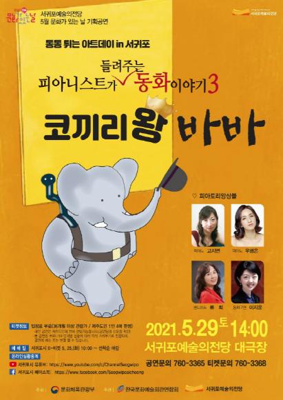 5월 개최될 “피아니스트가 들려주는 동화이야기 3 - 코끼리왕 바바”는 프랑스의 화가이자 동화작가 장 드 브루노프가 쓴 <코끼리왕 바바>동화를 바탕으로 프랑스의 대표적인 작곡가 생상스의 <동물의 사육제> 등의 음악이 어우러지는 음악회이다.