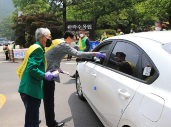 특히 한라수목원을 찾은 시민 및 관광객에게 마스크 및 휴대용 손소독제를 배부하고, “코로나19 최고의 백신은 마스크 착용”이라며 마스크 착용의 중요성 및 사회적 거리두기 수칙 준수를 거듭 강조했다.