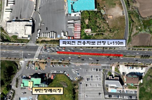 좌회전 전용차로를 연북로 부민장례식장 앞 교차로까지 L=110m와 구산마을 입구 교차로 동·서 각 L=50m 연장하게 된다.