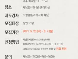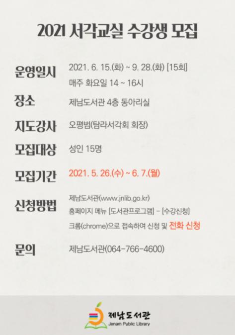 제주특별자치도교육청 제남도서관은 지역주민을 대상으로 2021 서각교실 수강생을 6월 7일까지 모집한다.