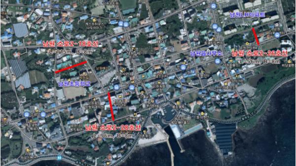서귀포시는 남원읍 남원1리 마을 안 남원도시계획도로(소로2-18, 2-26, 2-28호선) 개설에 총사업비 1,700백만원(공사비: 514, 보상비: 1,186) 투입하여 사업을 마무리 하여 개통 했다고 밝혔다.