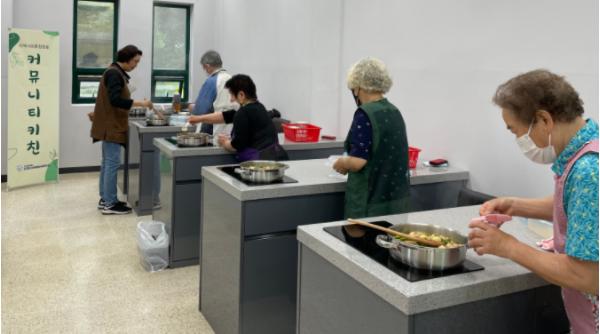 「커뮤니티 키친」은 지속적인 식생활 관리가 필요하거나 외로움 우울감을 겪고 있는 노인을 대상으로 요리수업과 영양교육을 실시한다. 다양한 조리법으로 밑반찬을 만들 뿐만 아니라 이웃과 식사 공유를 통해 유대감을 형성할 수 있는 기회를 제공하여 어르신들의 지역 내 공동체 생활 지원을 목표로 한다.
