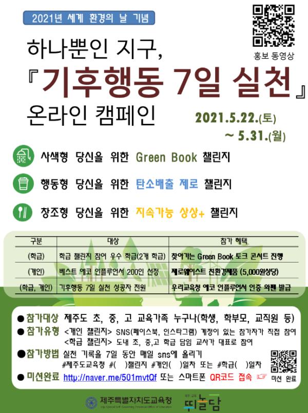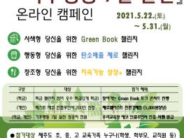 지난 5월 22일부터 5월 31일까지 진행한 2021 세계 환경의 날 기념 「기후행동 7일 실천」 온라인 챌린지도 교육가족의 많은 관심과 참여 속에 마무리되었다. 챌린지 분야는 △Green Book 챌린지 △탄소배출 제로 챌린지 △지속가능 상상 챌린지였고, 참가자들은 개인 또는 학급단위로 7일 동안 매일 SNS에 실천을 인증하면서 지구를 위한 작은 실천에 동참했다.