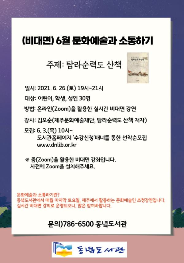 동녘도서관은 지역주민과 제주에서 활동하는 문화예술인과의 만남의 자리를 마련하고자 ‘(비대면) 6월 문화예술과 소통하기: 탐라순력도 산책’ 참가자를 모집한다.