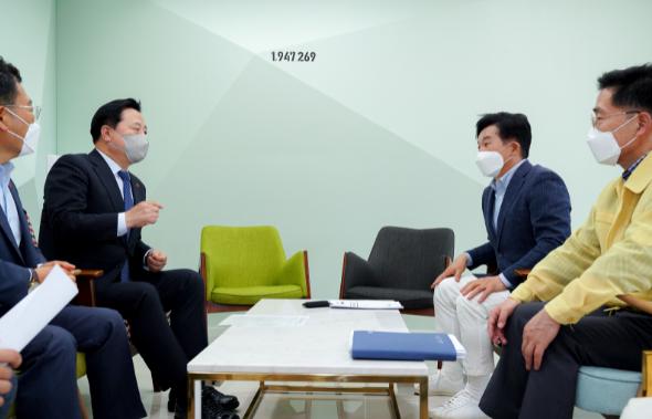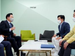 원희룡 도지사는 5일 오후 4시 30분 집무실에서 김두관 국회의원과 면담하고 제주도민 선제적 예방접종 등 코로나19 시대 안전한 제주관광 환경 조성을 위한 협력 방안에 대해 논의했다.