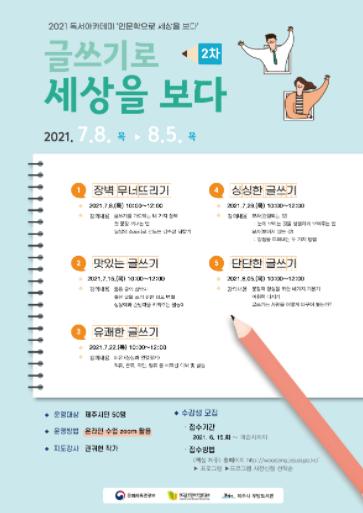 교육은 7월 8일부터 8월 5일까지 매주 목요일마다 운영되며, 글쓰기에 관심 있는 시민 50명을 대상으로 줌(ZOOM) 플랫폼을 활용한 온라인 수업으로 진행된다.