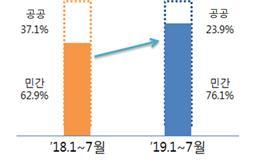 올해 1~7월 벤처펀드의 출자자를 살펴보면, 민간의 출자액이 1조 5,644억원으로 전체 2조 556억원의 76.1%를 차지하며 공공정책기관이 출자한 4,912억원의 3배를 넘었다. 모태펀드, 성장금융, 산업은행, 지자체 등 지난해 1~7월 민간의 출자액 비중이 62.9%를 차지했던 것과 비교할 때 크게 증가한 수치다.