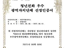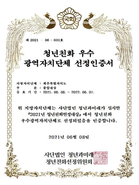 제주특별자치도는 6월 8일 국회사무처 소관 사단법인 ‘청년과 미래’가 주관하는 ‘2021 청년친화헌정대상 우수광역자치단체 평가’에서 2019년에 이어 3년 연속 종합대상에 선정됐다고 밝혔다.