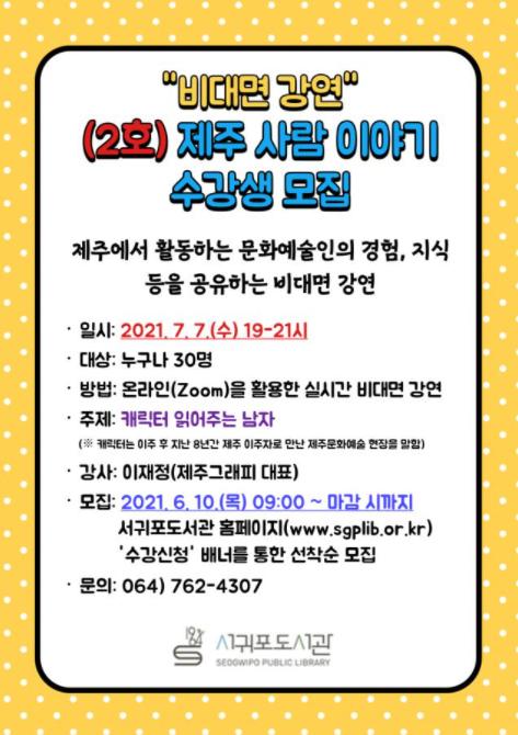 비대면 온라인(Zoom) 방식으로 진행되는 이번 강연은 이재정(제주그래피 대표)강사의 지도로‘캐릭터 읽어주는 남자’라는 주제로 오는 7월 7일(수) 오후 7시부터 9시까지 운영한다.