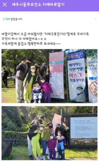 해당 행사는 제주시동부보건소 치매안심센터 ‘치매바로알기’ 밴드에 가입 후 지정된 걷기코스인 동백동산(4.8km)과 비자림 공원(3.2km)을 완주한 뒤 코스 내에 치매안심센터 홍보 배너 인증샷을 밴드에 업로드하는 방식으로 운영됐다.