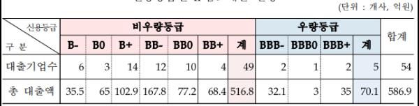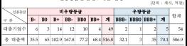 IP담보대출 기업의 신용등급은 최저 B-등급부터 최고 BBB+등급 까지 분포되었고, 이 중 신용등급이 높지 않은 BB+등급 이하 기업에 대한 대출이 90.7%를 차지했다.