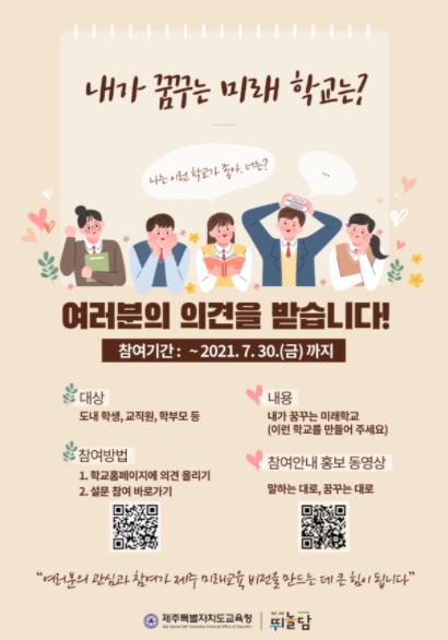 ‘학교와 함께 만드는 제주미래교육 비전’은 도내 유치원·초·중·고등학생, 교직원, 학부모를 대상으로 6월 14일부터 7월 30일까지 제주미래교육 비전 관련 설문 참여하고, 내가 꿈꾸는 미래학교의 모습(학교상, 교사상, 학생상)에 대한 활동 결과를 홈페이지 탑재하는 방식으로 운영된다.